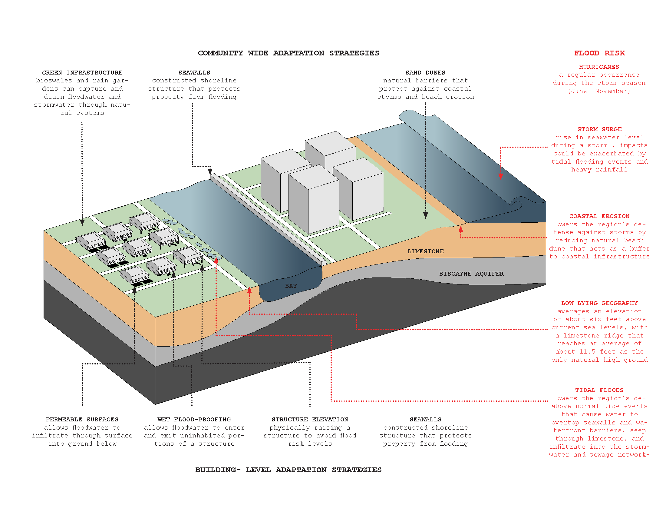 I served as a research assistant to University of Miami’s School of Architecture’s Center for Coastal Resiliency which assessed local Miami districts’ vulnerability to floodwater. I was responsible for illustrating the findings for the NSF grant floodwater community analysis report(s). Below are examples of the layouts and graphics produced for this project.